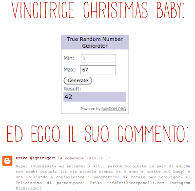 Quindi cara Babyapepazza ti sei aggiudicata il Christmas kit. Scrivimi pure una mail con l’indirizzo a cui spedirti il tuo bottino. Grazie per aver partecipato.