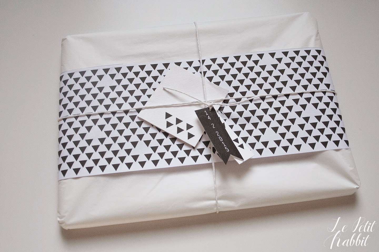 Rifilate l’illustrazione e incorniciatela. Con un pò di nastro adesivo unite le due bandine con la fantasia a triangolini, otterrete così una banda che vi permetterà di avvolgere la cornice per tutta la lunghezza. Io ho completato il tutto con la carta velina bianca e un cordino bianco. Ecco il mio pacchetto. Potete scegliere qualsiasi colore di base per il pacchetto, ad esempio della carta color rosso o un’altra fantasia geometrica a contrasto.