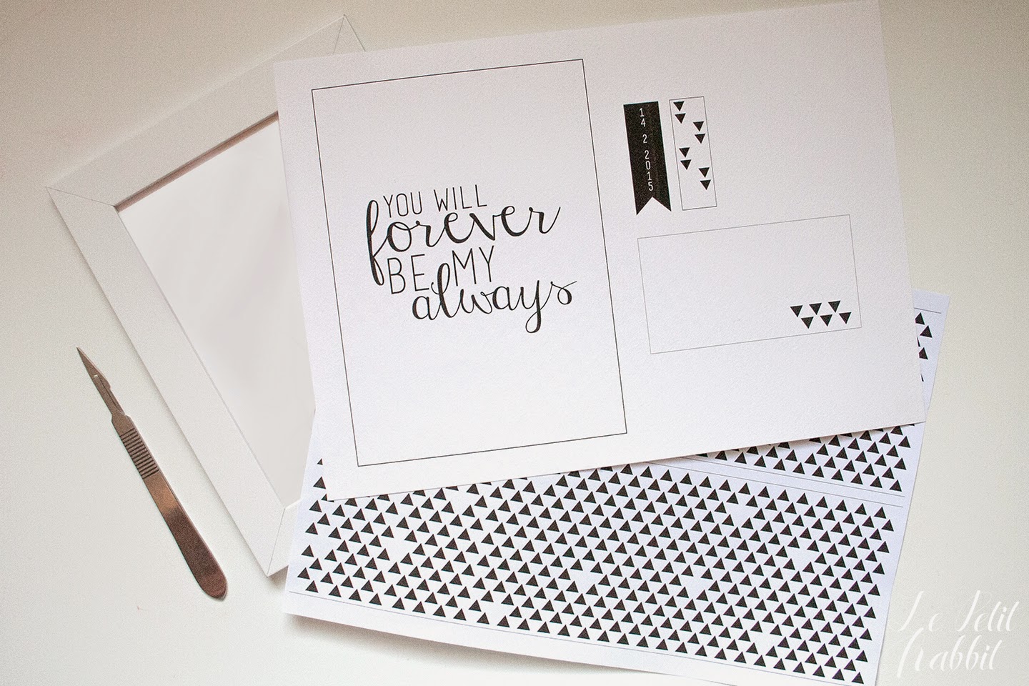 Procuratevi una semplice cornice bianca o nera formato 13×18(io ho usato una Nyttja Ikea formato), un cutter e stampate i due free printable che trovate QUI e QUI. Il mio consiglio è di stampare l’illustrazione con le tag per il packaging su un cartoncino e la fantasia a triangoli su carta più leggera.