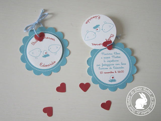 Oggi vi mostro un invito per un baby shower che entrambi i genitori di Edoardo hanno voluto organizzare per radunare tutti i loro amici, vicini e lontani. Un invito piccolo piccolo come il loro futuro bimbo e tenero come loro due. Trovo dolcissimi i due uccellini che guardano il loro uovo, dove però dentro batte già un cuoricino. Ovviamente non poteva mancare l’azzurro, ma non ho saputo rinunciare al rosso dell’amore. La mia sensibilità di neo mamma è stata decisamente toccata.