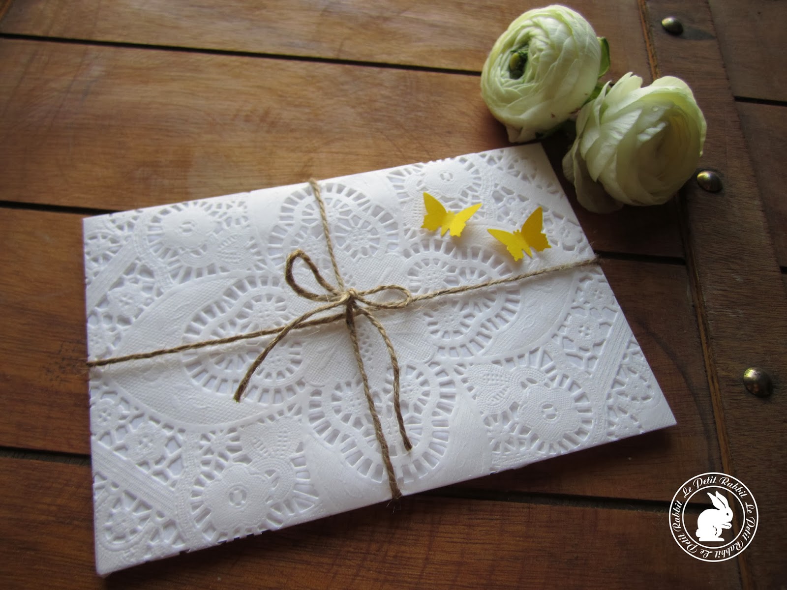 Per rendere il progetto accessibile a tutti ho fatto una ricerca tra i vettoriali gratuiti, apportato le modifiche del caso e poi disegnato il biglietto d’invito. Non ho ovviamente saputo rinunciare a due particolari: le farfalle in treddì (amo scriverlo in questo modo errato) e una busta realizzata con un centrino di carta pizzo. Il tutto chiuso con spago grezzo e da qualche altra farfalla treddì.