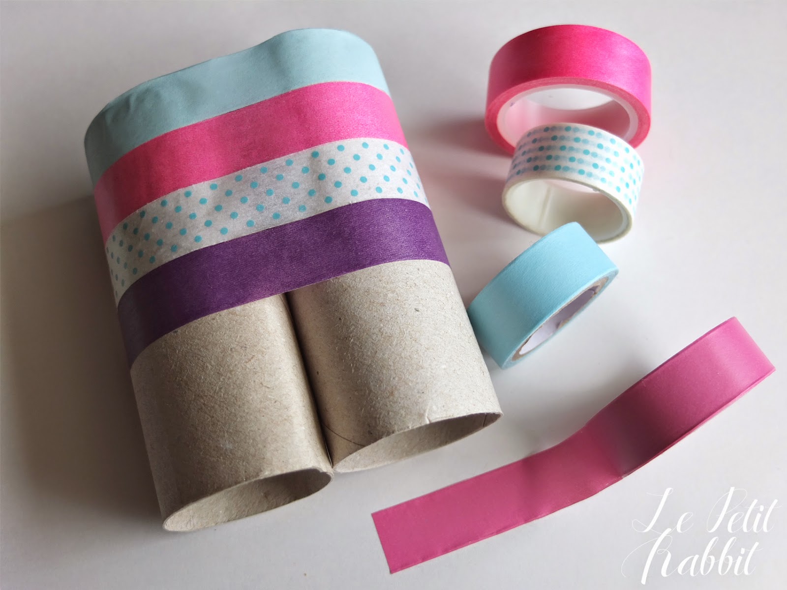 Avvicinate i due tubi di cartone e iniziate a fasciarli con i washi tape, non c’è una regola, andate di fantasia e preferenza nell’accostamento dei colori.