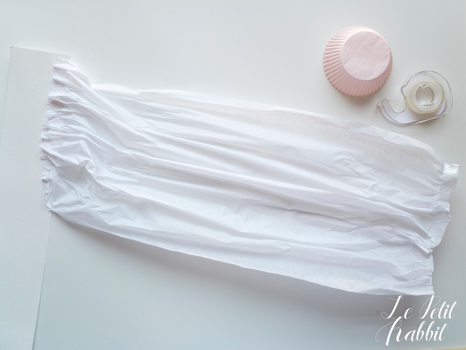 Ritagliate la carta velina per avere un primo foglio 50×70 cm e iniziate a pieghettare un’estremità. Mano a mano che create le pieghette fissatele con il nastro biadesivo alla fascia di cartoncino. Una volta terminato il primo foglio procedete allo stesso modo con il secondo. Con la pieghettatura dovete arrivare all’incirca a metà della fascia di cartoncino.