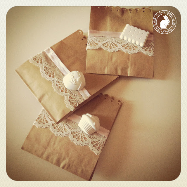 Sacchetti in carta kraft, pizzo, nastro in raso e dei fantastici gessetti che ho realizzato e profumato al talco. Biscotti, cupcakes e barattolini di miele per omaggiare l’infinita dolcezza della piccola festeggiata.
