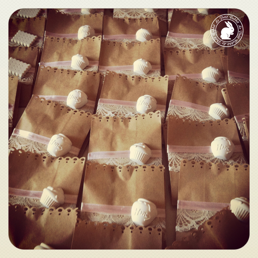 Sacchetti in carta kraft, pizzo, nastro in raso e dei fantastici gessetti che ho realizzato e profumato al talco. Biscotti, cupcakes e barattolini di miele per omaggiare l’infinita dolcezza della piccola festeggiata.