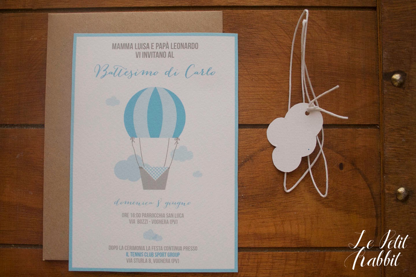 Questo è un Battesimo fresco e leggero come l’aria, tra mongolfiere, nuvole e uccellini.