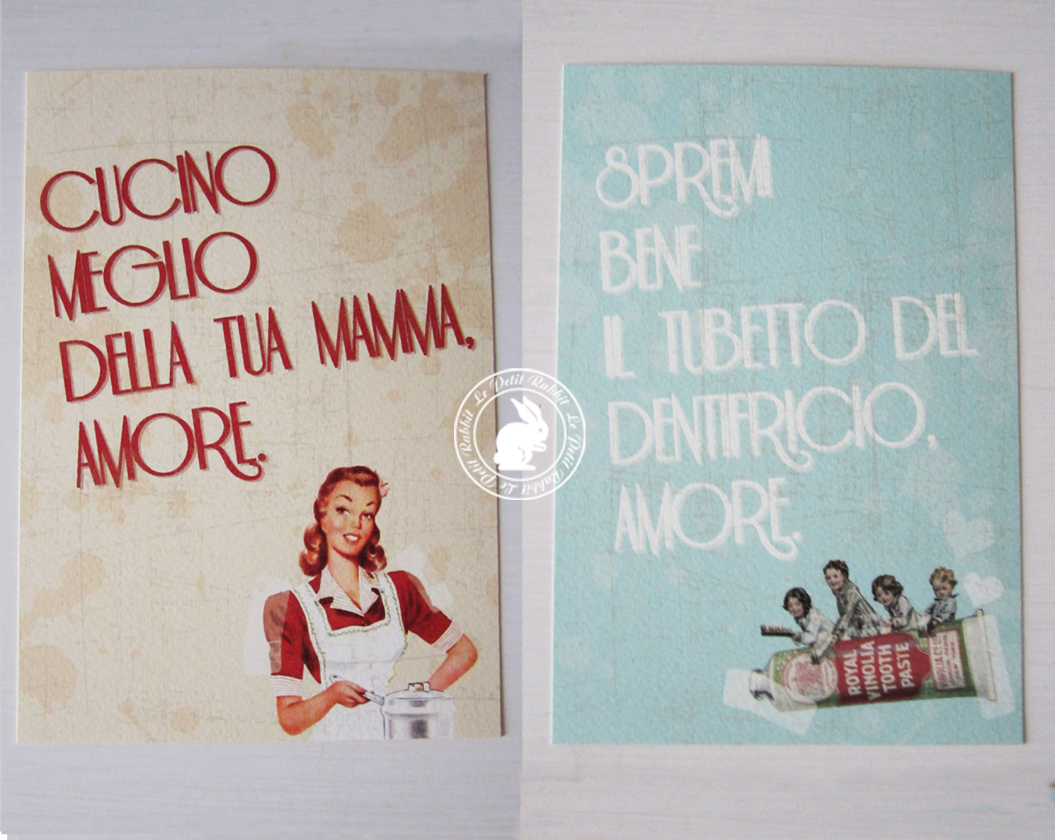 rieccomi qui…fuori è così buio che sono in casa con qualche candela accesa. Adoro la loro luce fioca. A casa nostra si cena sempre a lume di candela. Ogni sera, in qualunque stagione. Mio marito è un uomo molto dolce e romantico e come me adora mantenere certe tradizioni. Ma come tutti anche lui qualche difettuccio lo ha…è un pò smemorato per alcuni semplici gesti quotidiani. Ed è capitato molte volte che gli lasciassi dei post it per ricordargli ad esempio che il tubetto del dentifricio non va stritolato, bensì spremuto dal basso in modo graduale. Ed ecco come è nata l’idea di questi quadretti che ho sfornato per il Memoires de Noel. Ho voluto ovviamente dargli un’anima un pò retrò, altrimenti non avrei potuti appenderli in giro per casa :).