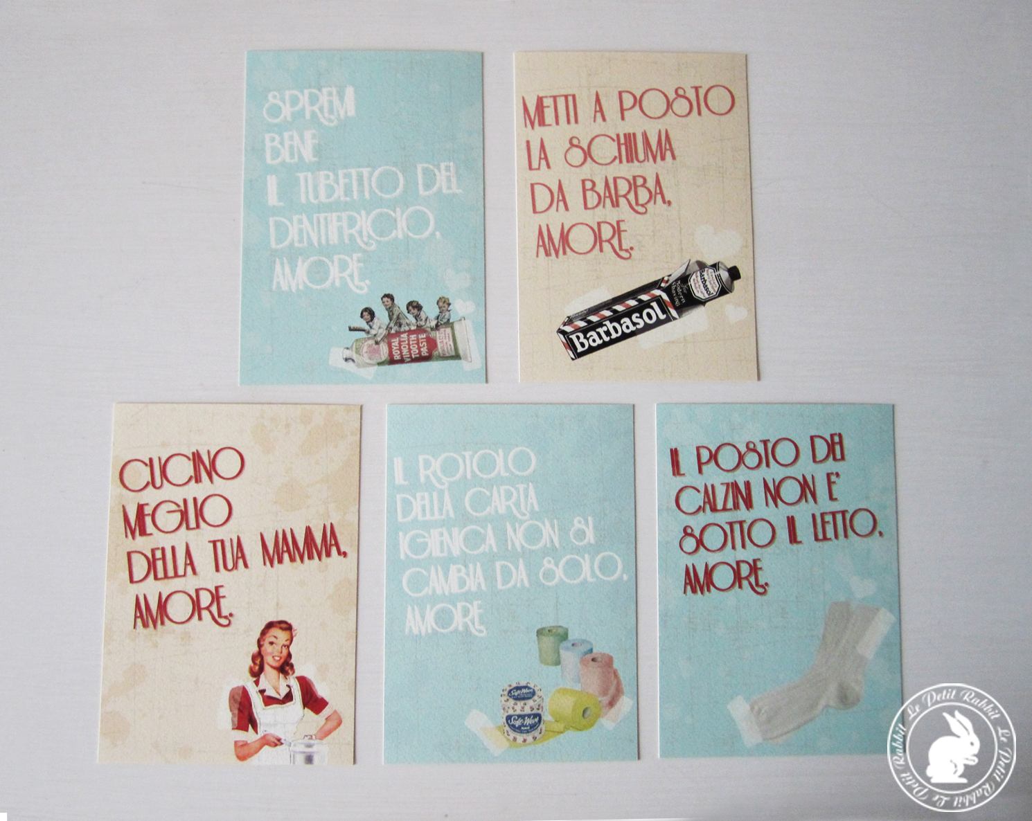rieccomi qui…fuori è così buio che sono in casa con qualche candela accesa. Adoro la loro luce fioca. A casa nostra si cena sempre a lume di candela. Ogni sera, in qualunque stagione. Mio marito è un uomo molto dolce e romantico e come me adora mantenere certe tradizioni. Ma come tutti anche lui qualche difettuccio lo ha…è un pò smemorato per alcuni semplici gesti quotidiani. Ed è capitato molte volte che gli lasciassi dei post it per ricordargli ad esempio che il tubetto del dentifricio non va stritolato, bensì spremuto dal basso in modo graduale. Ed ecco come è nata l’idea di questi quadretti che ho sfornato per il Memoires de Noel. Ho voluto ovviamente dargli un’anima un pò retrò, altrimenti non avrei potuti appenderli in giro per casa :).