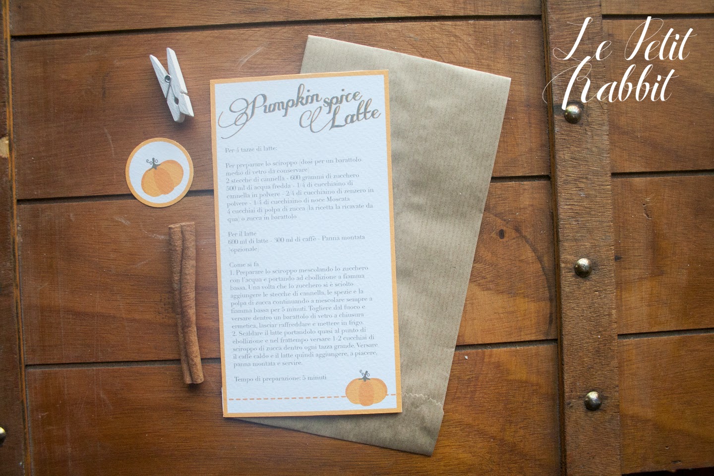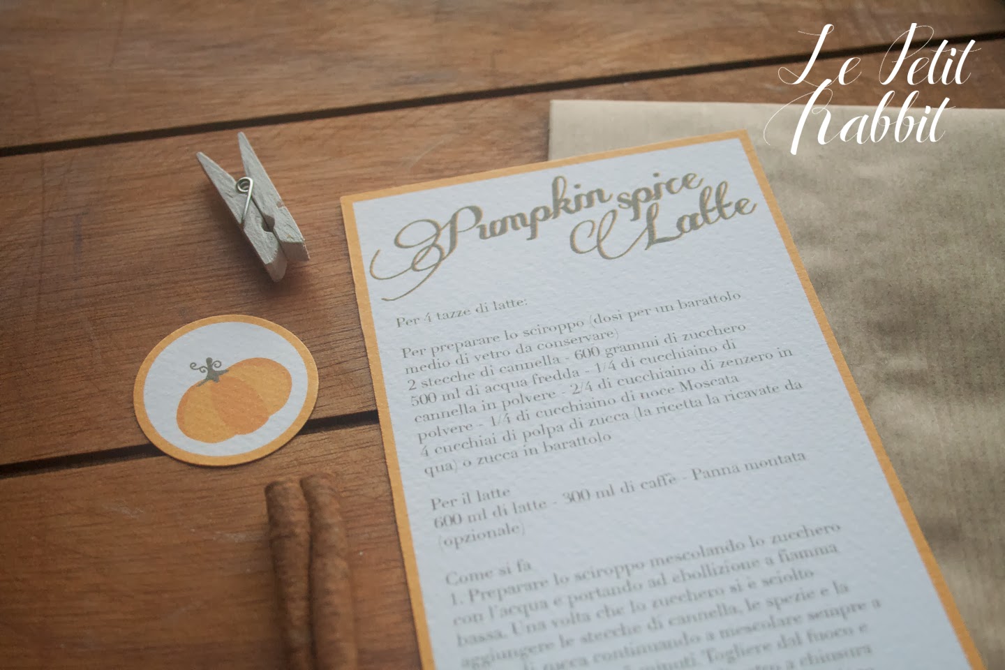 Per i bimbi ho preparato delle piccole scatolette ripiene di bon bon morbidosi e caramelle frizzy all’arancia (alla zucca credo non le abbiamo ancora inventate). Una semplice tag per ricordare loro che si è scelto il “dolcetto”…ma quest’anno ho voluto fare anche un’altra cosina, un pensierino per i genitori che in questa sera accompagnano i più piccoli in giro per le case di sconosciuti. Non so da voi, ma qui hanno sempre un’aria un pò imbarazzata e timorosa perchè non è detto che tutti abbiamo lo spirito di Halloween. Ho scelto di regalare loro una ricetta che mi sta molto a cuore. La ricetta del Pumpkin Spice Latte, una bevanda gustosissima che ho bevuto per la prima volta in Canada durante il viaggio di nozze. La si trova in una nota catena di caffetterie e ogni scusa era buona per fermarsi e bere una tazza di Latte alla zucca. Quindi la reputo una delle ricette del cuore, ma prima di proporla ho girato un pò su internet in cerca di una ricetta homemade, genuina e sana e l’ho trovata nel sito de La cuochina sopraffina , che ringrazio molto. Per leggere per intero la ricetta cliccate qui, provatela perchè sono sicura ne sarete entusiaste.