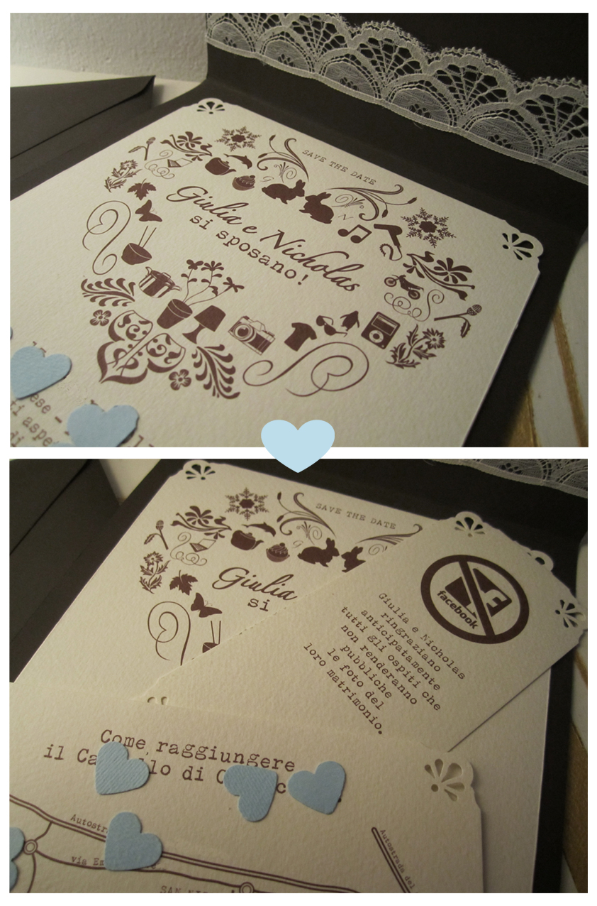 Non poteva mancare un pò di pizzo. All’interno tanti cuoricini sfusi. Il piccolo vinile racconta la nostra storia in un video dolce e ironico al tempo stesso. E ovviamente un piccolo reminder per tutti i nostri ospiti, per ricordare loro che non siamo tipi da facebook, almeno il giorno del nostro matrimonio!