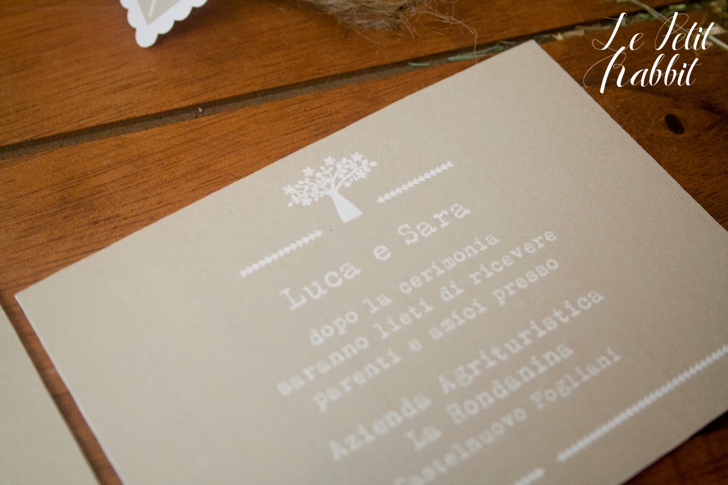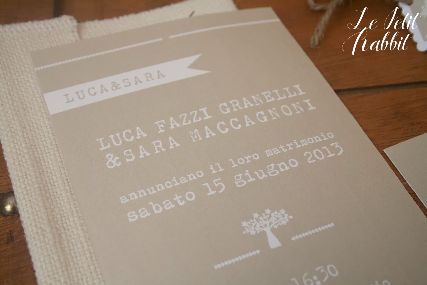 Per Luca e Sara ha pensato ad un matrimonio Rustico Simply: iuta più o meno grezza, lino, piante aromatiche, candelabri in tinta naturale. La partecipazione rispetta tutto questo con un tono rustico semplice ma originale.