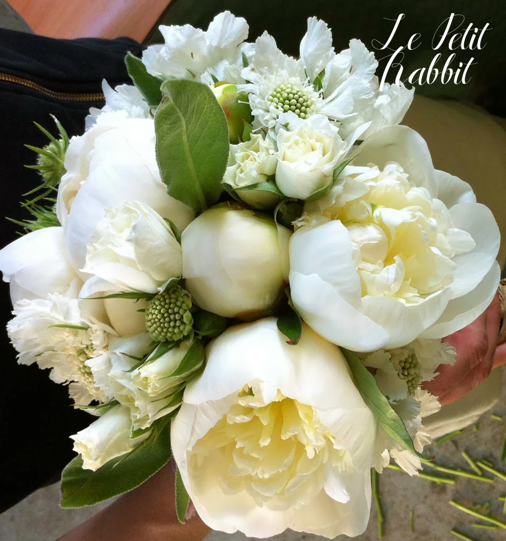 Il bouquet una poesia di peonie, scabiosa, roselline ramificate e salvia.