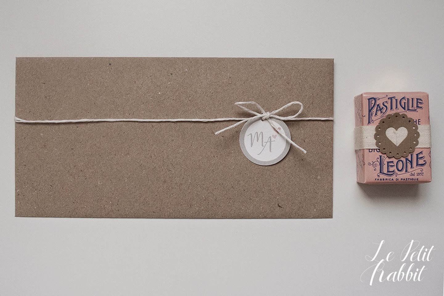 La busta craf è confezionata con un cordino grezzo bianco e una tag con le iniziali degli sposi.